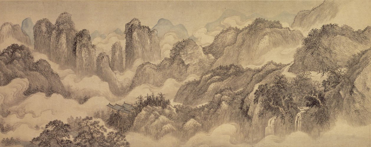 畫面上峰巒起伏,云霧迷茫,其中間的瀑布、雜樹、竹亭、山石以濃密的雨點皴出之。全圖工整謹密,秀潤蒼渾,“筆簡景少,氣壯意長”。