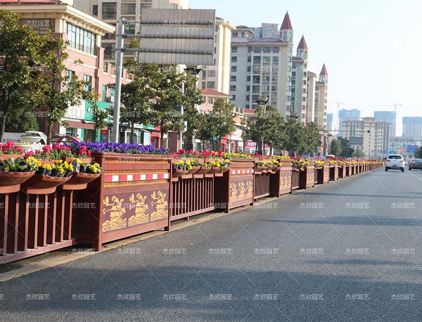 城市道路上的花箱組合的款式很多??此茝?fù)雜,但劃分開來可以分為花箱和花箱的組合,花箱和護欄的組合。這兩種花箱組合就是目前市政使用主要的兩種樣式。
