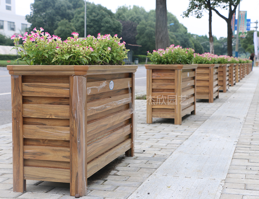 我指著其中的一種花箱說道:這是最早的戶外花箱,就是防腐木花箱。
