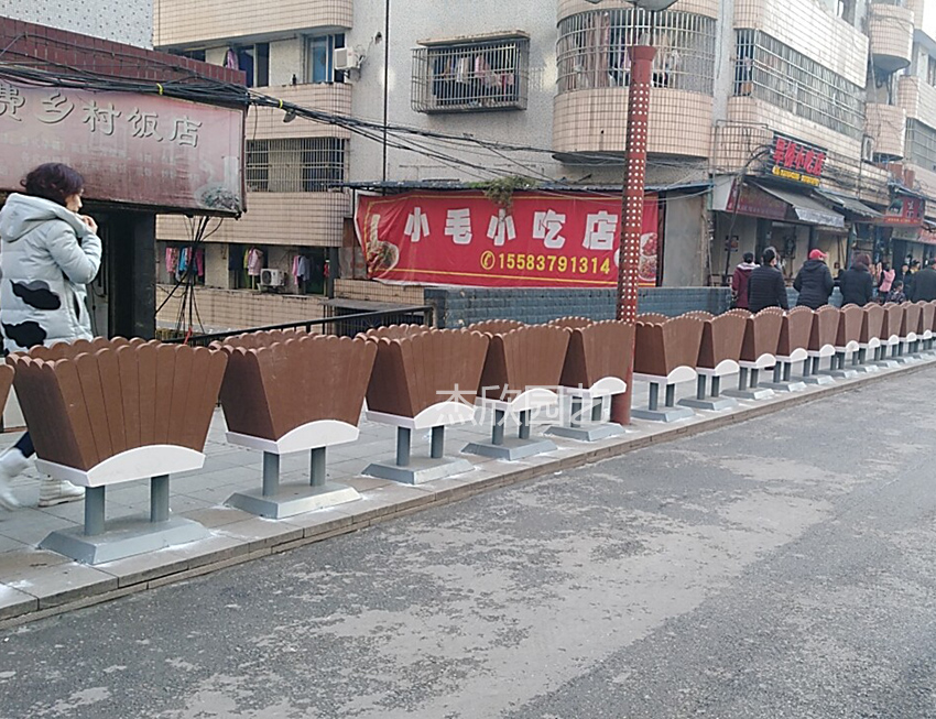 pvc花箱采用扇形的傳統(tǒng)意象,看上去別致許多。護(hù)欄則用豎格組成,張弛有度。