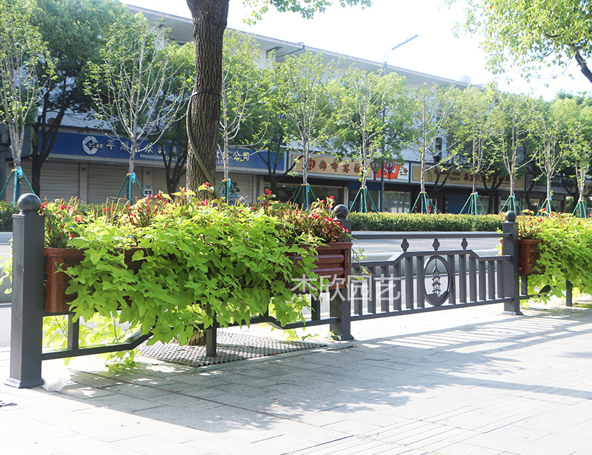 護(hù)欄花箱不同于組合花箱,護(hù)欄花箱具有道路隔離景觀作用。組合花箱的作用集中在街道景觀。護(hù)欄花箱一般由護(hù)欄和花箱組成,花箱以PVC、鋁合金為主,護(hù)欄以鋅鋼、鋁合金為主。