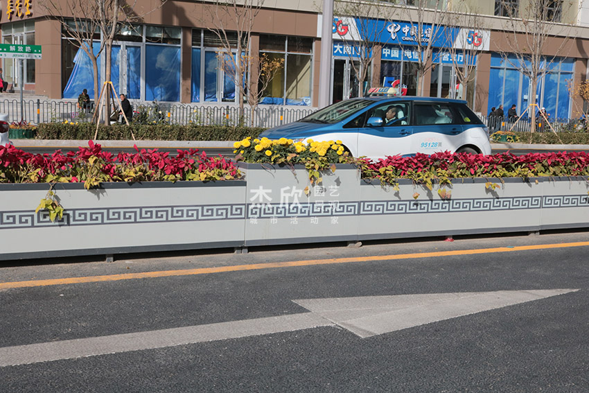 太原解放路道路花箱以回紋元素為設(shè)計(jì)亮點(diǎn),以傳統(tǒng)色為新意,打造出一方盛景。茶白、鴉青,兩種傳統(tǒng)色與新工藝碰撞,融合成既富有現(xiàn)代氣息又不失古典韻味的現(xiàn)代花箱。采用鈑金材質(zhì),極力呈現(xiàn)現(xiàn)代工藝的美感和質(zhì)感。