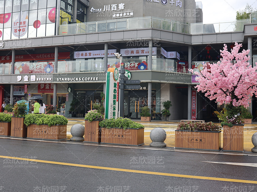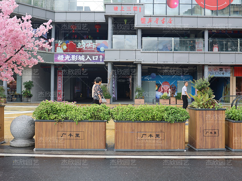 鋁合金黃檀木色組合花箱,采用豎拼結(jié)構(gòu),更為新穎,灰色包邊增添與城市廣場(chǎng)的融合程度。