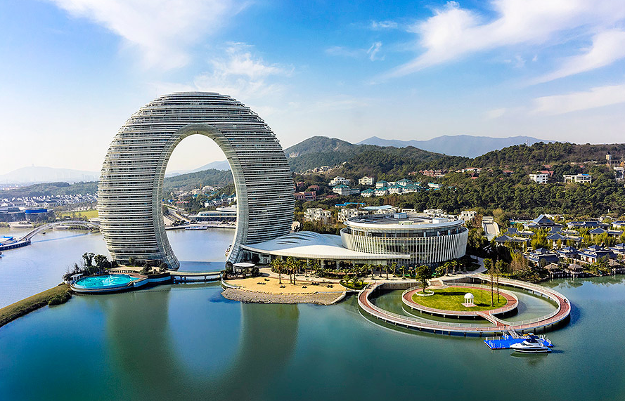 太湖畔有一座月亮酒店,與東方明珠遙遙相望。世界知名設計師、奧運會同款精工鋼構、人工挖湖……令月亮酒店媲美全球豪華酒店。