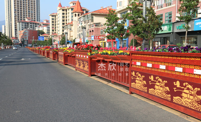 通過傳統(tǒng)朱紅、明黃配色,打造出富有傳統(tǒng)韻味的道路花箱。
