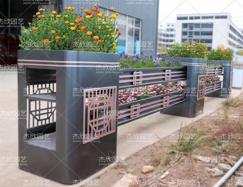 園林是中國建筑美的杰出代表,也是中國人對人居環(huán)境的詩意闡述。園林寄托著人們對美好生活的向往。園林藝術(shù)在當(dāng)代設(shè)計中也屢見不鮮,并深受喜愛。這組道路花箱將園林之中的窗格藝術(shù)之美融入其中,取其神,去其形,用現(xiàn)代手法表現(xiàn)出祥瑞之意。