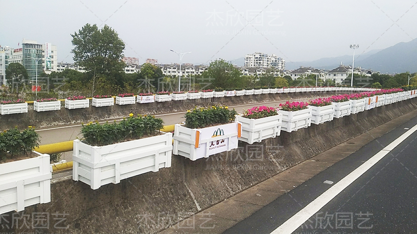 1、懸掛式花箱。懸掛式花箱安裝便利,只需要安裝在橋梁的護(hù)欄上即可。懸掛式花箱規(guī)格較小,花箱與花箱間距合理,能夠呈現(xiàn)出相當(dāng)不錯(cuò)的橋梁景觀?;ㄏ漕伾x擇以白色居多。