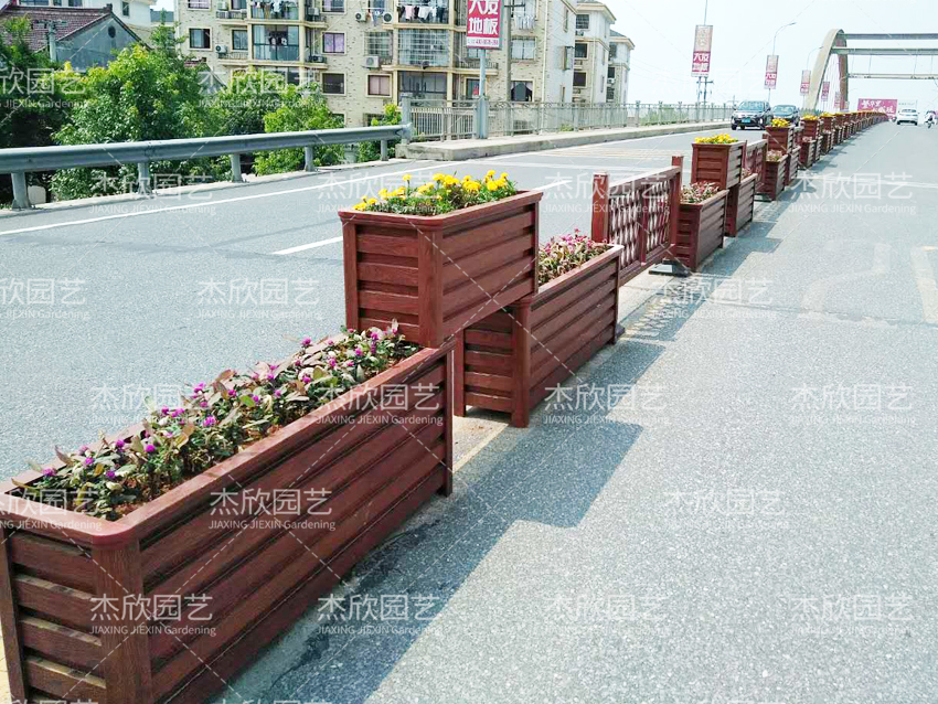 一般橋梁路面兩側(cè)的寬度窄,花箱的規(guī)格偏小,花箱樣式簡(jiǎn)單。橋梁道路中央隔離帶寬度較大,花箱的規(guī)格偏大,花箱樣式豐富。